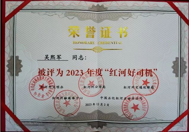 12月2日,在由中共紅河州委精神文明建設(shè)指導(dǎo)委員會主辦、紅河州公安局、紅河州交通運輸局、紅河州融媒體中心、中國石化紅河石油分公司共同協(xié)辦的紅河州2023年度“紅河好司機(jī)”評選活動中,云南神斧爆破工程有限公司黨員、駕駛員吳熙軍同志被評為2023年度“紅河好司機(jī)”。